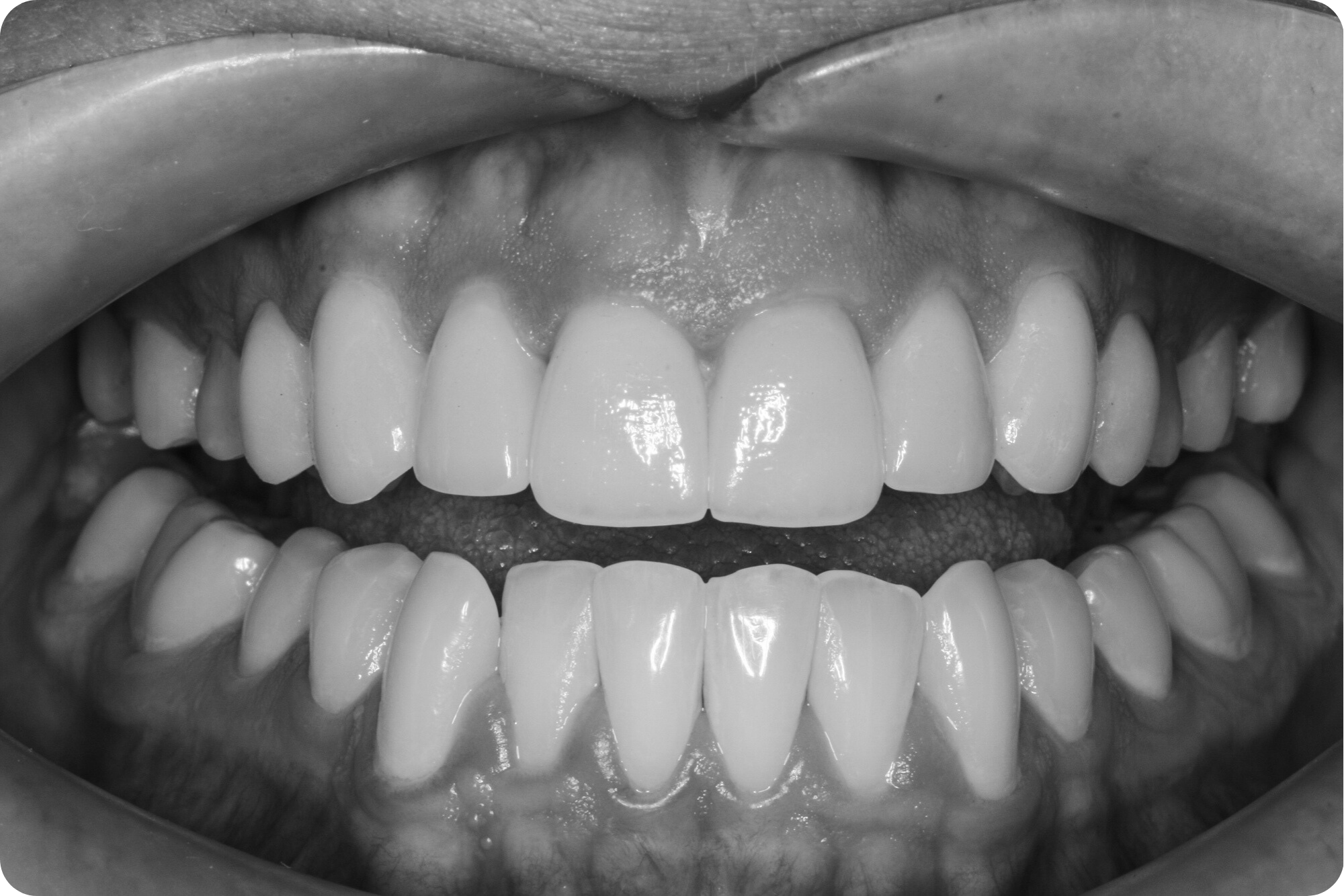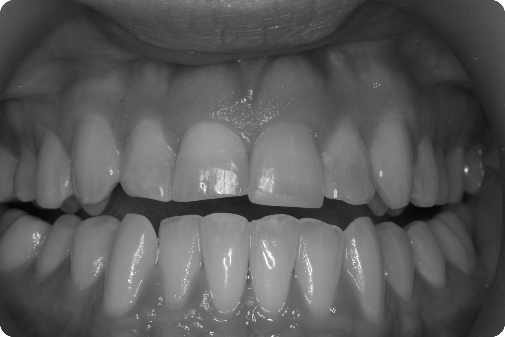 This patient had already been through orthodontics to straighten her teeth, but once the braces came off, her teeth still felt unfinished. Slanted, uneven edges from years of wear and discolouration within her enamel stood in the way of the smile she had always dreamed of: brighter, polished, while still natural and true to her.
